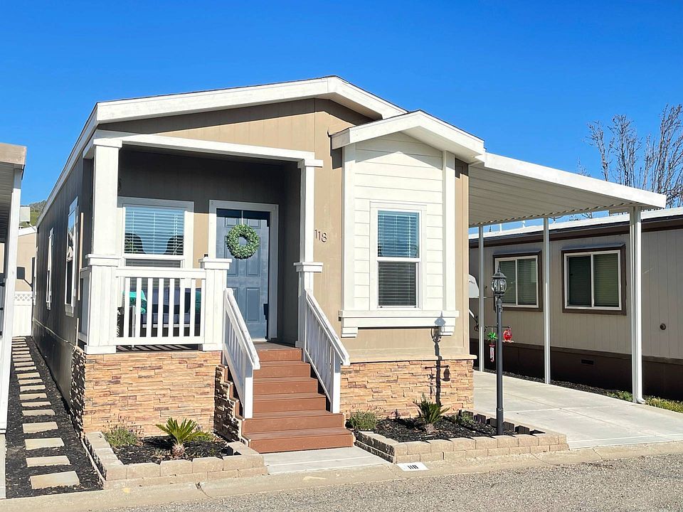 JUST LIKE BRAND NEW! This is a gorgeous, like-new 2 bedroom/2 bath home. This unique 2018 floor plan features tons of upgrades! This home features high 9' ceilings with plenty of windows! This is one bright and happy home. Lovely front porch with trex decking enters into beautiful open concept living area. Plenty of counters and hardwood cabinets with great stainless steel appliance package. Pantry closet. Two spacious bedrooms with sliding wardrobe closets, 2 bathrooms. Lovely vinyl flooring features a trendy barnwood style look. A/C and central heating work great! Separate laundry area with washer/dryer set included! Back door exits to carport for easy access! Private covered parking space fits 3 vehicles and ample room to install a shed! 25 year shingles! Warranty included by sellers for the right offer. A list of qualified lenders is available upon request Comfortable, safe, and QUIET country neighborhood! If you love deer, horses, and friendly neighbors then this is the place for you! Clayton Palms is a REMODELED all-ages community nestled in the beautiful country hills of Clayton. NEW amenities include pool, fitness center, large clubhouse with kitchen, playground, dog park, basketball/soccer field, game room, laundromat, onsite management, maintenance & grounds-keeping. Lots of guest parking. We are on the Brentwood side of Clayton, near the intersection of Deer Valley and Marsh Creek road. Come visit us and enjoy the scenery! PER038411CAA/B Offered by Horizon Manufactured Homes DL1273578