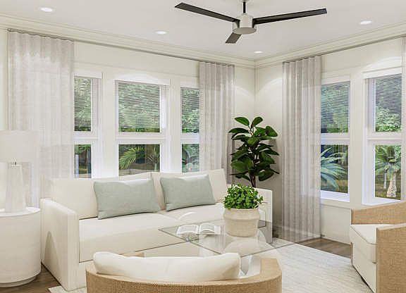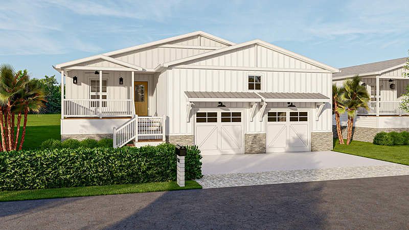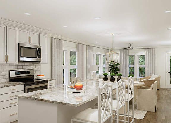 Osprey Bay, a brand new vibrant 55+ community by the beach opening in Fort Myers this fall!The Camelia, a premier coastal cottage, designed by an award-winning team features a color-coordinated exterior with detailed board and batten, stone skirting, and custom lighting. A front porch and beautiful landscaping add charming curb appeal. A front porch and beautiful landscaping add charming curb appeal. Inside, the modern kitchen with stainless steel appliances leads into thoughtfully designed spaces, including a main bedroom with an en suite bathroom.