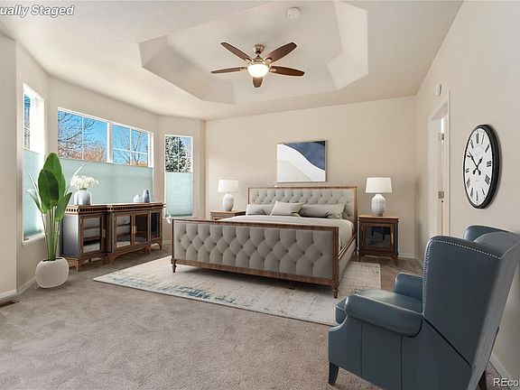 Spacious and well-maintained corner lot home in the highly sought-after Anthem Ranch community of Broomfield! The moment you step inside, you'll be captivated by the inviting open floor plan that defines the main floor living space. The kitchen is a true standout, boasting upgrades and KitchenAid stainless steel appliances. The huge living room is both welcoming and elegant, featuring a gas fireplace and easy access to the back deck, where you can soak in the outdoors and enjoy moments of relaxation. The primary bedroom is a true retreat, adorned with tray ceilings and bay windows that infuse the room with natural light. You'll appreciate the privacy of the en-suite bath, creating a serene space to rejuvenate. A guest bedroom also offers en-suite bath access, making it ideal for hosting with ease. Outside, the pergola-covered back deck and the fenced pet area offers a peaceful space where you can entertain, savor the Colorado sunshine, and ensure your furry friends have their own space to roam. Additional features include an attached 2-car garage for your convenience, seller-paid solar panels that enhance energy efficiency, and the convenience of a washer and dryer included with the home. Anthem Ranch offers an abundance of community amenities, including a clubhouse with fantastic offerings like a pool, fitness center, and park. This home in Anthem Ranch delivers a blend of elegance, comfort, and convenience that you won't want to miss! 55+ age restricted community.