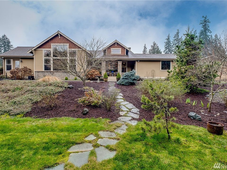 Beautifully REMODELED CUSTOM RAMBLER walking distance to Mill Creek Town Center. 2238 SF updated living space w/vaulted ceilings, 4 skylights. Stone gas fireplace LR & Stone Rock stove in Kitchen. Rich teak hardwood flooring. Exquisite Gourmet Chefs Kitchen, dbl oven, warmer, 6 burner stove/pot filler slab granite & custom cabinets! 3 bedrooms + Den/could be 4th bed. Huge detached 28X30 shop 220 power, heated. RV parking w/sewer & power. Beautiful landscaping & fenced. Minutes to I-5 & I-405