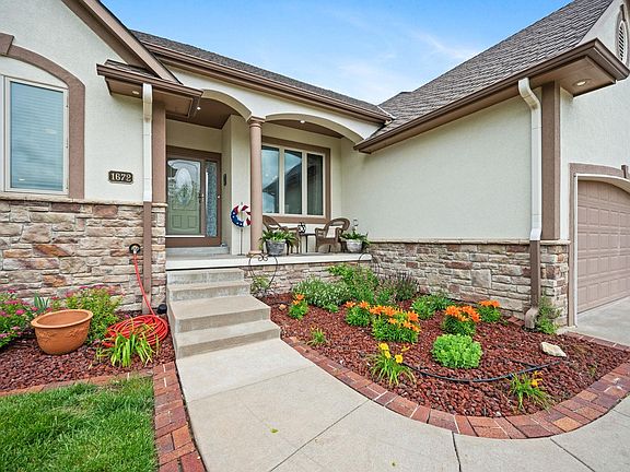 Welcome to Your Dream Home! This single-owner, custom-built residence blends contemporary elegance with cozy charm. Located in the desirable Tiara Pines neighborhood, this home is a serene retreat for those seeking comfort, style, and convenience. As you arrive, the manicured lawn and vibrant landscaping welcome you, the inviting facade features classic architectural elements, including a covered porch perfect for your morning coffee or evening drink. Step inside to discover a spacious, well-designed interior. Hickory hardwood floors flow throughout, and large Colby windows fill the 10-foot-tall rooms with natural light. The gourmet kitchen will delight culinary enthusiasts, and bakers alike. Equipped with stainless steel appliances, an induction range, two sinks (both with disposals), custom Alder cabinetry, and a center island, this kitchen is both functional and beautiful. Perfect for family meals or hosting dinner parties. Adjacent to the kitchen, the living room invites you to unwind with its cozy fireplace and elegant finishes. The luxurious primary suite offers a peaceful oasis with tray ceilings, a private deck, a walk-in closet, and a spa-like ensuite bathroom featuring a soaking tub, dual vanities, an oversized shower with dual shower heads, and a water closet. Two spacious bedrooms complete the main level (one with its own deck), while the basement adds two more bedrooms, including one with a private bath. The basement is perfect for entertaining with view-out windows, wood laminate flooring, a second stone fireplace, a large wet bar with microwave, nine-foot ceilings, and surround sound wiring. The backyard features multiple deck levels, ideal for outdoor entertaining or relaxing. The home also includes a convenient main-floor laundry room, with the option for additional laundry space in the basement. The three-car garage with additional length in the 3rd stall, provides ample storage space, and an indoor light switch controls the outdoor under-eaves outlets for your decorative needs. This home also boasts a 50-year roof and 50-year cement siding. Conveniently located near top-rated schools, parks, shopping, dining, and entertainment options, this home offers the perfect balance of privacy and accessibility. Experience luxurious living in Derby. Schedule your showing today and make 1672 E Tiara Pines your new address!