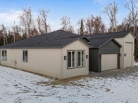 This one-of-a-kind custom home is a showcase of premium upgrades, including elegant arches, an 8ft exterior door, built-in shelving, wood beams, and vaulted ceilings. The gourmet kitchen features a custom-built hood, upgraded cabinetry, stainless steel appliances, double oven, quartz counters, and a matching backsplash, with ample storage throughout.This home features three beautifully designed bathrooms, each showcasing tiled floors and showers with built-in niches, while the master bath elevates relaxation with a luxurious soaker tub. The oversized 1,087 sq. ft. garage, featuring an RV bay 40 ft. long, is perfect for Alaska activities, offering plenty of space for vehicles, gear, and more. You'll notice the upgraded lighting package and countless other details that complete this stunning home, blending modern luxury with timeless charm! Final Grade to be completed in the spring.