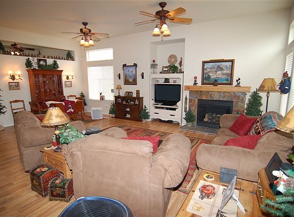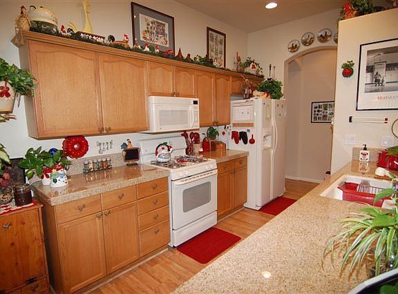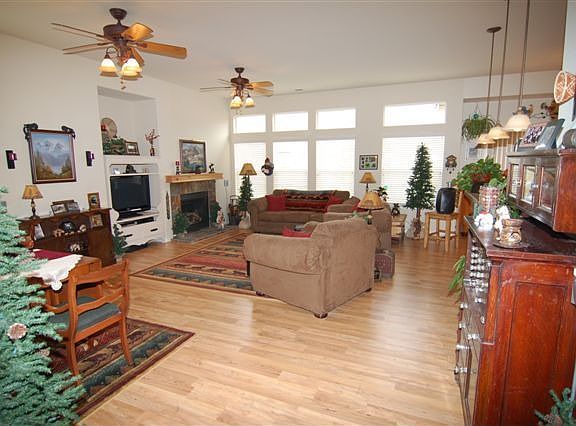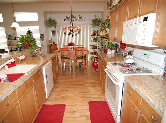 This great room floor plan is open and inviting. The kitchen has granite counters, a breakfast bar and nook. The master suite is oversized and has double sinks, garden tub, a large shower with glass surround and a walk in closet. Rooster light in the breakfast nook and rooster nobs in the kitchen, master bedroom fan, light fixture and towel racks in the master bathroom, will all be replaced with the original fixtures. The haning racks and work bench in the garage are not included.