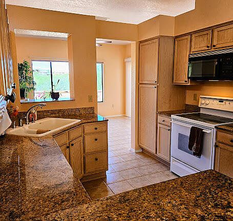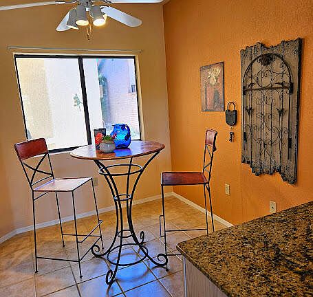Green Valley's fabulous sunsets and arroyo wildlife views can be enjoyed from the back patio, dining area, and living room. Easy access to the back patio is through glass sliders in the living room & kitchen dining area, as well as, a patio wall gate. The front door to this popular Oasis floor plan begins via an enclosed side yard walkway, a cute covered entry patio & a secure entry door. There are extra storage cabinets in the roomy 2 1/2 car garage & the laundry room, & both a coat & a linen closet in the hallway. Tile is throughout the house, granite kitchen countertops & a southwestern style paint decor + 7 skylights add charm to this comfortable home. Several rooms have newly installed windows which makes looking outside to the yard & arroyo, plus partial mountain views, a pleasure.