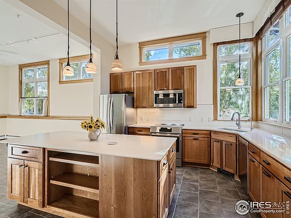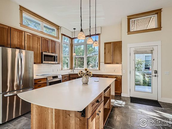 Rare opportunity to own in Silver Sage 50+ Cohousing Community. This green built, energy efficient home is part of a 16-home planned development designed for active adults. Come home to a bright open end unit with soaring 11 foot ceilings and a recently remodeled kitchen. No detail was spared in this 2022 remodel that includes premium Bosch appliances including induction stovetop, quartz countertops, oversized custom island and warm wood cabinetry and finishes. The main level open floor plan includes primary bedroom, full bath, walk-in closet, and laundry. Lower level provides 2nd bedroom, full bath, living area as well as a storage room. A Murphy bed has also been cleverly added here for housing additional guests. Detached garage included. Some of the MANY shared amenities include courtyard and gardens, mature landscaping, Community House with exercise room, art studio and community kitchen, bike storage, woodworking shop and garden storage. Located in north Boulder in the vibrant and desirable Holiday neighborhood, close to public transportation, restaurants, and trails. Walk to Spruce Confections, Amante Coffee, Moxie Bread Co, Proto's & more. Enjoy your own private home and the upscale shared amenities in a wonderful small community where residents know their neighbors! Please see additional information form under documents for community website and additional information.