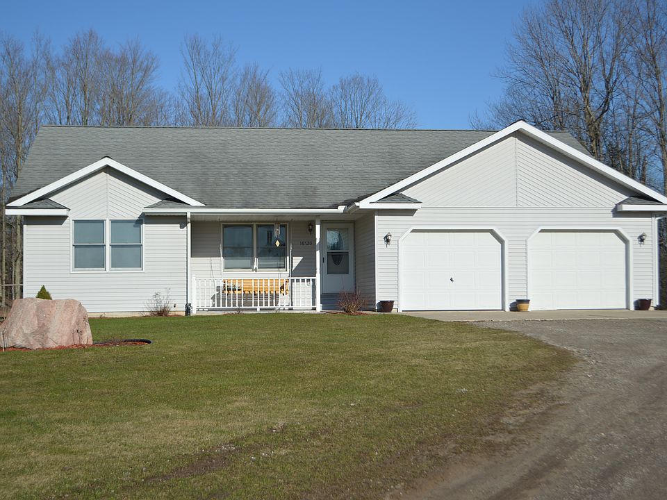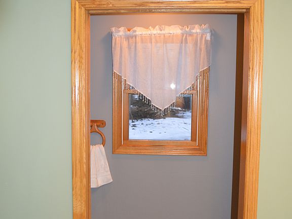 Newer ranch on grassy knoll, well back from the road. Beautiful surrounding views and lawns on 4 acre hilltop site with wooded backdrop. 4 bed, 2 1/2 bath home with great-room floor plan. Light oak kitchen, breakfast bar, tile floors, includes appliances. Dining area with slider to back deck and yard. Spacious living area with vaulted ceiling and stone fireplace (gas log). Main floor laundry room with half bath. Light oak trim and doors throughout. Attached garage, full walkout basement. Auxiliary garage/shop near the road is finished and heated, has its own electric and half bath. Peaceful private setting, beautiful surrounding area.