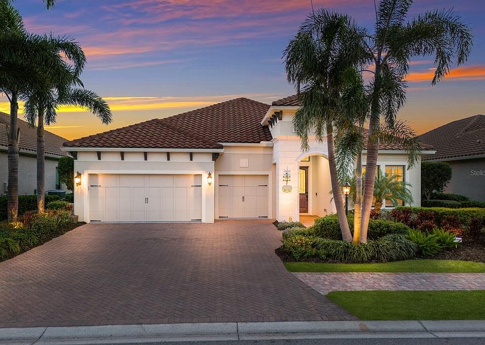 South-facing lake views take center stage from this stylish three bedroom, three full bath residence in the gated Lakewood Ranch community of Country Club East, encompassing 3,065 square feet of one-story open concept living showcasing numerous upgrades, perfectly proportioned spaces, built-in details, and the added benefit of a GENERATOR. An inviting lanai beckons with heated saltwater pool and spa with newer 2022 pool pump and heater, a newly re-screened lanai cage, and pre-plumbed for an outdoor kitchen. Seamlessly connecting the lanai to the great room and kitchen area are impact rated sliding glass doors that reveal the large great room with porcelain tile flooring laid on the diagonal, tray ceiling, crown molding, and a built-in entertainment dry bar with stone counters, cabinetry and soft-close drawers. Meanwhile chefs will delight in the beautifully appointed kitchen with stainless steel GE appliances, generous island with granite counters, abundant cabinetry with pull-out drawers, soft-close drawers, a walk-in pantry, and an inviting breakfast nook engulfed by the surrounding lake views. Relax and unwind in the privately situated owner’s suite, offering expansive sitting area, tray ceiling, serene lake views, two walk-in closets, and a spa-like bath with separate sink vanities, invigorating open shower, and separate water closet. Overnight visitors will be right at home in two additional guest suites each on separate wings, both with full bath access and large walk-in closets. Off the foyer gallery, the residence offers an oversized formal dining area that offers many alternate flex living options, while the home’s office is positioned off the owner’s suite behind double glass doors boasting lake views and engineered wood flooring. Other highlights of this maintenance-free retreat includes optimal laundry room with sink, cabinetry and storage closet, whole-home generator, privacy window shutters, impact windows/doors/sliders on the front and back of the house, hurricane shutters for the aquarium window and sides of house, upgraded Therm Trudoor entry door, quartz counters in all bathrooms, soft-close drawers for all the cabinetry in home, gutters all around the home, and a built-in drop zone with cabinetry off the generously-sized three car garage, Country Club East provides its residents with the privacy of gated-community living, the resident only Retreat, three community pools, and fitness center, all within a renowned community known for its vibrant Lakewood Ranch lifestyle surrounded by dining, shopping, polo, golf, tennis, community events, Waterside, UTC Mall, and the beaches of Sarasota nearby. Residents also have the non-mandatory option to become members of the Lakewood Ranch Golf and Country Club, which offers four championship golf courses, two clubhouses, tennis, pickelball, fitness facility, heated pools, full social calendar and so much more.