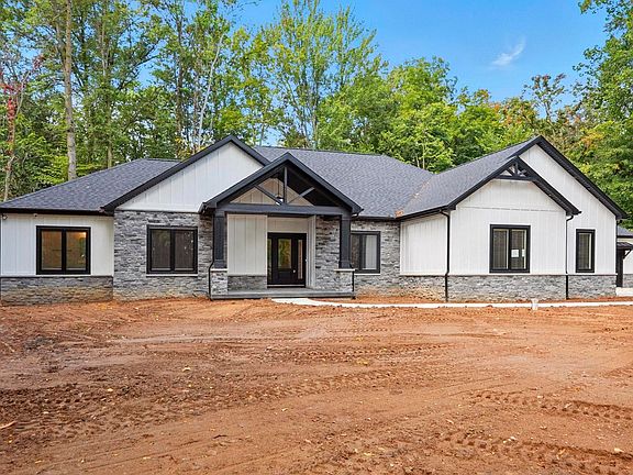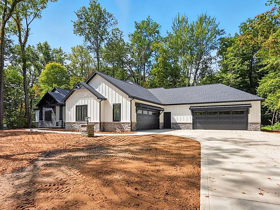 OPEN HOUSE 11-16-2025 from 12-2 PM. This sprawling J&K ranch with 5 bedrooms, 4 full baths and 2 half baths, on a finished basement is sure to impress with over 5,000 finished square feet and Anderson E-Series windows. As you enter under the covered front porch, you are greeted by a stained barrel ceiling. The living room features a gas fireplace, built in shelves and a vaulted ceiling. The open kitchen features a quartz countertops, tiled backsplash, soft close cabinetry and a walk in pantry, GE Monogram appliances, coffee bar, built in shelving and more! The main bedroom ensuite features double vanities, garden tub, a walk in tile shower and a walk in closet. It is accompanied by 3 other bedrooms on the main level, one of which has its own en-suite and the other 2 share a jack-n-jill bathroom. The massive basement has a theatre room, exercise room, giant living & dining area, wet bar, and the 5th bedroom with en-suite. The covered back stamped concrete patio would be great for relaxing and enjoying the wooded backdrop this lot provides! 4 car attached garage, with a concrete drive and turnaround. The home also features a speaker system(interior and exterior), and alarm system. Yard being put in soon. Built in oven installed 9/10 in Kitchen. New photos coming soon once the yard is put in.