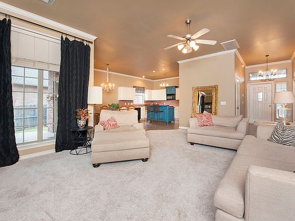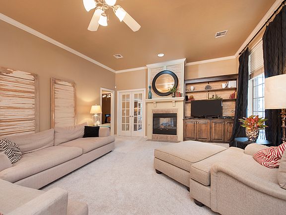 Wonderful Home W/Crown Molding Throughout Most of Home, New Carpet & Fresh Paint. Nice Open Layout W/High Ceilings. Living Rm is Spacious W/See Through Fireplace Into Study. Study Has Glass French Double Doors, Beveled Ceiling, Ceiling Fan, Crown Molding & Sep Patio Access. Living Rm has Built In Bookshelf/Entertainment Center, Storage & Ceiling Fan. Kitchen Has Open Layout W/Island/Breakfast Bar, Lots of Cabinet & Counter Top Space, Freshly Painted Cabinets & Sep Dining. Inside Utility off Kitchen & Garage Entry. Secondary Bedrms are Spacious W?Ceiling Fans, Walk In Closet & Hallway Bath. Master Bedrm is Sep From Secondary Bedrms W/Spacious Layout, Wonderful Natural Light & Ceiling Fan. Master Bath has Double Vanities, Jacuzzi Tub, Spacious Australian Closet & Sep Shower. Faux Wood Blinds Throughout. Ext Back has a Nice Covered Patio, Fully Fenced & Spacious Backyard. Storm Shelter in Garage. Neighborhood Walking Trail, Playground & Pond.