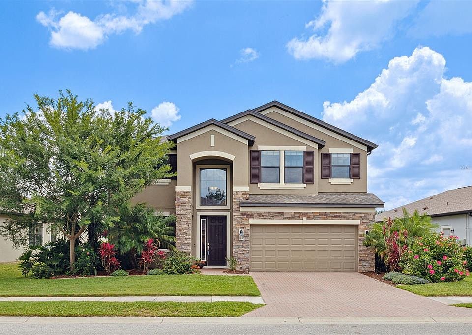 MOVE IN READY! DON’T MISS OUT TO OWN THIS BEAUTIFUL HOME! The popular Sonoma II floor plan by MI Homes with model like UPGRADES GALORE on a gorgeous private huge almost ¼ acre fenced-in lot situated in highly sought after community of LONG LAKE RANCH! Home features 3,531 of luxurious living space, 5 bedrooms, 3 baths plus den/office or convert to formal dining room, large bonus room & oversized 3 car tandem garage. 1 bedroom & full bath downstairs great for guests or in-laws. This is the perfect place to call home! Brick paved driveway & walkway to the Grand entrance. Enter the home into an open foyer and feel the openness of the high ceilings with beautiful wood floors. Large gourmet chef’s kitchen features granite, stainless steel appliances, built-in double oven, staggered 42" cabinets with crown molding, walk in pantry, pendant lighting, center Island, breakfast bar & nook area. Right off the kitchen is the Butler's pantry. The kitchen opens to a spacious family room, also sliding glass doors open to a large private covered lanai, extended patio with brick pavers, fire pit & Pergola, great for entertaining! Enjoy the peace & tranquility of your backyard with beautiful views! Plenty of backyard space to enjoy BBQ’s with family & friends! Large master with walk-in closets & trey ceiling. Beautiful master bath with upgraded tile, granite countertops, garden tub & huge walk-in shower. Home also features: newer roof 2019, A/C condenser 2022. LONG LAKE RANCH community offers resort style amenities includes pool with kids splash pad, basketball courts, tennis courts, community boat ramp for non-motorized boat access, park, playground, dog park walking trails and much more. Close to all, Veteran’s & Suncoast Expressway, SR 54/41, International Airport & downtown Tampa, MacDill AFB, hospitals, shopping, schools, golf courses, restaurants, beaches. A MUST SEE! CALL TODAY FOR A PRIVATE TOUR OF THIS STUNNING HOME!
