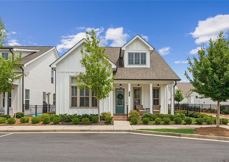 Welcome to the “Harrison A” – an open floorplan that perfectly blends sleek design with effortless living, just minutes from Suwanee Town Center and the Greenway. Start your day on the inviting front porch, the ideal spot for morning coffee or evening wine. Inside, you’ll find luxury LVP floors and elegant crown and baseboard molding that add a polished, high-end touch. Plantation shutters fill the space with natural light while offering timeless charm. The living room is a showstopper – complete with a modern shiplap feature wall and a cozy gas fireplace you can control with the flip of a switch or remote. Recessed lighting sets the mood for relaxing nights or lively gatherings. The kitchen is pure culinary eye candy, anchored by a show-stopping “Fantasy Brown” marble island and countertops. The oversized center island seats four, making it the perfect gathering spot while entertaining. Stainless steel Whirlpool appliances – including a Smart WiFi 5-burner gas range, microwave, and vent hood – elevate this kitchen for both everyday cooking and gourmet meals. White shaker cabinets with under-cabinet lighting brighten your workspace, while a decorative subway tile backsplash adds just the right pop of style. A smartly designed pantry is seamlessly tucked within the cabinetry, and yes – the refrigerator is included! Just off the kitchen, you will find a dedicated dining room that sets the stage for everything from cozy dinners to lively gatherings. Sliding glass doors open to a covered porch, featuring upgraded beadboard ceiling and a cooling ceiling fan – the perfect spot for unwinding after a long day. The fenced backyard defines the space beautifully and adds a polished touch to the outdoor living area, creating your own outdoor retreat. The Owner’s Suite is located on the main level and is a luxurious retreat, boasting high 12’ ceilings that create an expansive feel. The primary ensuite offers a spa-like experience with its "super shower," a double vanity with extra drawer space, and a generous walk-in closet, providing plenty of storage. Upstairs, two large secondary bedrooms await, perfect for family or guests. They share a well-appointed upper-level bath with a convenient double vanity. Need more storage? A spacious unfinished walk-in attic offers incredible potential for all your belongings. Enjoy Modern conveniences at your fingertips with a laundry room featuring a smart Samsung washer & dryer to remain, and built-in cabinets. 2-car garage featuring a smart garage door, a Ring alarm system (unmonitored) included, and a Schlage Wifi Deadbolt on the front door. Imagine a life where your weekends are truly yours, thanks to HOA-provided lawn maintenance, leaving you free to enjoy the best of community living at your community pool, firepit, parks, walking trails, play area, and clubhouse.