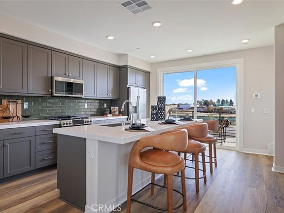 The Residence three is an end unit location with only one shared wall and an abundance of windows at the. The first level of this three-story townhome is host to a versatile office and half-bathroom that can easily be used as a media room or workspace. Upstairs, the kitchen, family and dining rooms are situated on the second floor among a convenient open floorplan, offering access to an outdoor deck for effortless entertaining. Three bedrooms can be found on the top floor, including the luxurious owner’s suite. All GE Appliances are included along with the refrigerator, washed and dryer! Spacious open living with a kitchen island and a sliding door that leads to a balcony. The neighborhood will have a community pool, BBQ's, firepit and a dog park. No Mello-Roos taxes, close to Disneyland, and easy access to the 5 freeway!