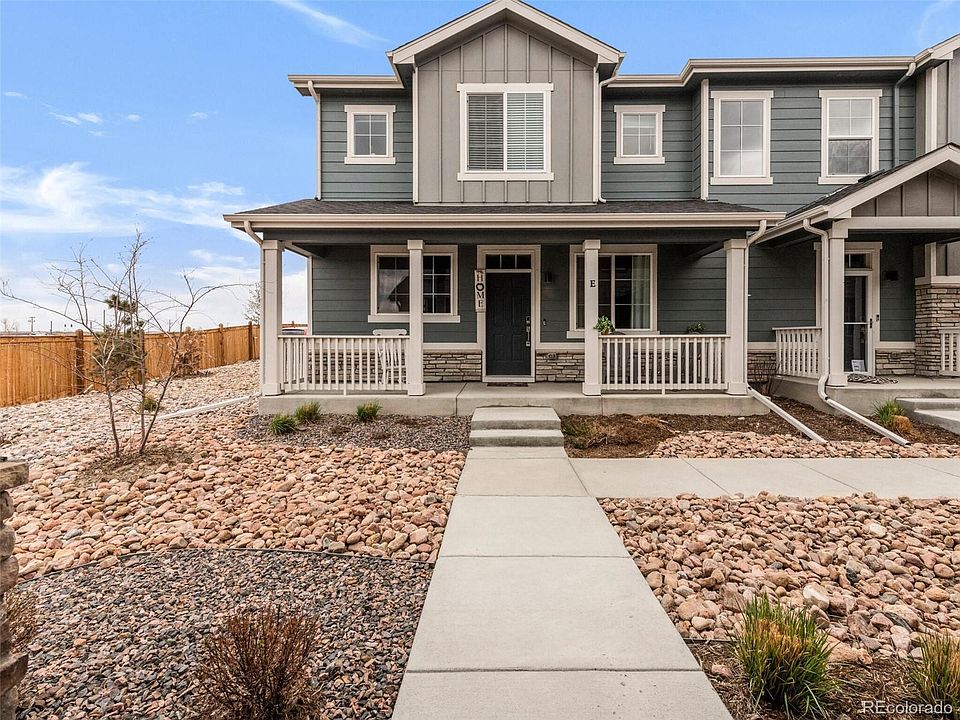HOA’s are less than $100 am month! Priced to sell quick, don't miss out! This end unit townhome has so much natural light and has desirable open concept. It is located next to 4 open parking spaces! It is near community park and Buffalo Run Golf Course with low maintenance living! This home is located just 1/4 mile from E470, less than 10 mins from Prairie Center Shopping, less than 15 mins from DIA & 25 mins from downtown Denver! The spacious great room is open to the dining room, making it perfect for entertaining. Sleek grey luxury vinyl plank hardwood floors span the entire main floor of the home. Located upstairs is a large Primary bedroom which features dual walk-in closets and a luxurious bath ensemble with ample countertop and cabinet space. A large shower completes the master bath. Upstairs you will also find a large convenient laundry room, a second bedroom and a second full bath with granite countertops, tile floors and tub/shower combo.