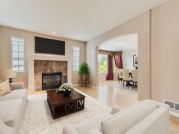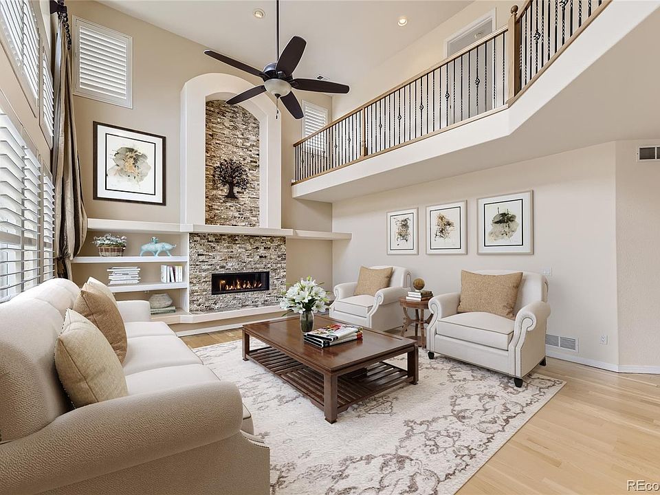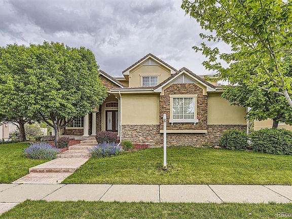 Welcome to this BEAUTIFUL home located in the highly desirable Piney Creek Village, just minutes from Cherry Creek State Park and within walking distance to the Trails Recreation Center. Dramatic open floor plan. Gorgeous hardwood floors. The main level features a grand curved staircase, a private bedroom with an ensuite bathroom perfect for your guests, an office with French doors, and a huge family room with a 20 ft ceiling and fireplace. The dining room flows into the gourmet kitchen with a huge island, gas stove, double oven, slab granite, and more. The luxurious master suite boasts a fireplace, a large walk-in closet, and a spa-like ensuite bathroom. The second floor also includes three additional bedrooms with ensuite bathrooms and walk-in closets. In your fully finished GARDEN-LEVEL basement, you'll find a theatre, rec room, game room, bar, stage, 1/2 bath, and workout room. A truly one-of-a-kind backyard where you can relax, play, or entertain in style. This house has it all! Welcome Home!