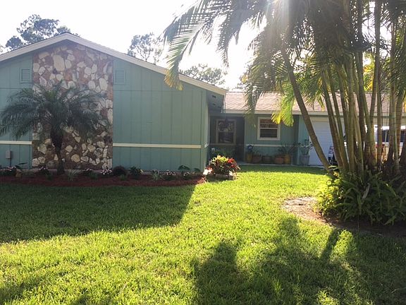 This is your next home! Move-in ready! Spacious 3 bedroom 2 bathroom home in the heart of Jupiter Farms. Full-size living room with beautiful built-ins and large upgraded kitchen with plenty of storage. There is tile, laminate or bamboo throughout. You'll love the large master bedroom with two built-in closets, private full-size bathroom and a your own private patio. Every room has a ceiling fan including the kitchen. Relax in the privacy of your own backyard swimming pool and huge screened in patio. Huge lot size of 1.09 acres with tons of fruit trees and a huge garden with raised beds! Located on a paved road and close to I-95. This home has so many great features including two patios, pool, built in fire pit, garden, and fruit trees. A perfect home!