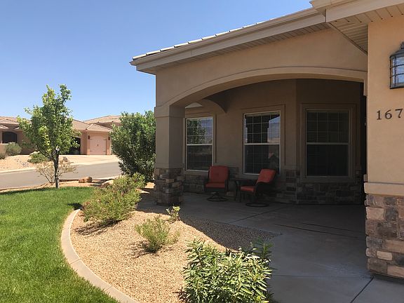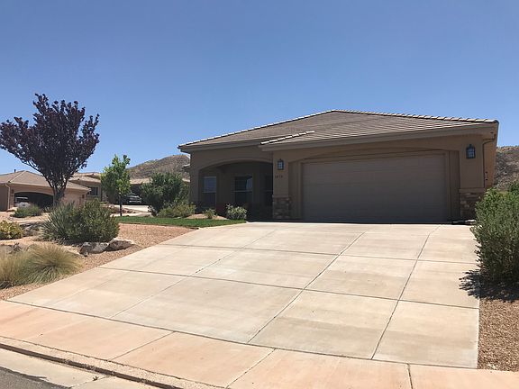 This home located in Scenic Sunrise has great views of Pine Valley Mountain! Open floor plan with private master suite. 12 ft ceilings, granite counter-tops, double vanities in master, huge master closet, tile floors, and more! Fully fenced backyard with mature landscaping, covered patio and RV parking. Very well cared for used as a second home.