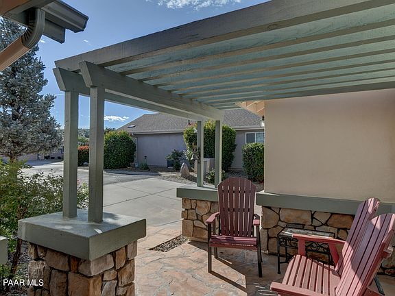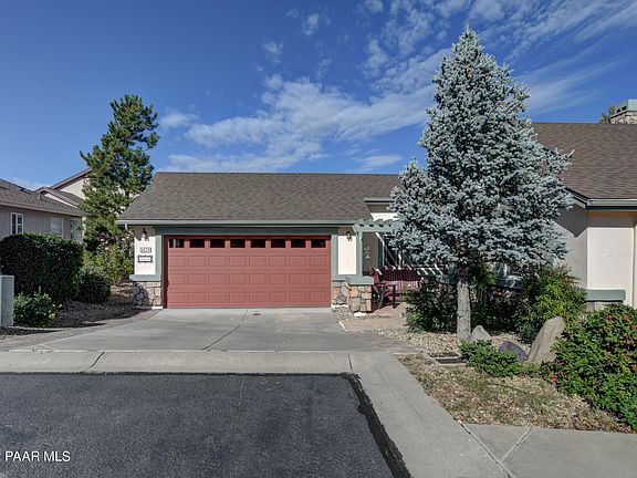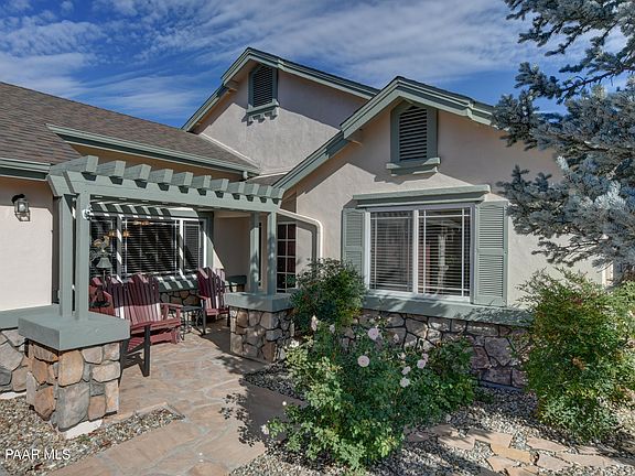 Wow, what a lovely home! This cozy cottage-style home is located in beautiful Prescott Lakes-minutes from 2 lakes, shopping, restaurants, hospital, schools! Plus-an assumable VA loan with a low rate! This 2 bedroom plus office, 2 full bath home is 1767 sf, and was built in 2003. With a charming pergola/courtyard entry-a perfect place to sip coffee and chat with the neighbors! The living room is a perfect size, with windows overlooking the back garden, cozy gas fireplace and plant/art shelves. The kitchen features stainless steel appliances, wood cabinets, granite counters, and a breakfast nook with additional cabinets. The spacious primary suite features vaulted ceilings, bay windows, a good sized bath with a garden tup, separate shower, and a dual sink vanity. Outside you'll find