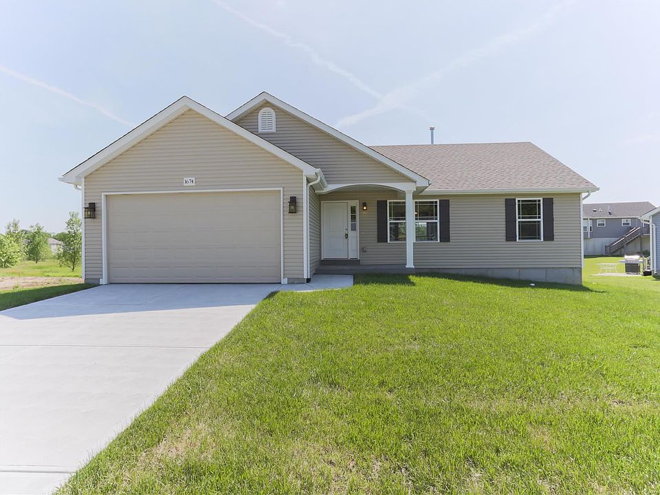 FINISHED HOME!! Don't miss out on this opportunity to own a BRAND NEW HOME! This 1,310 sq. ft. ranch home in Stonewater features 3 bedrooms, 2 full baths, first floor laundry, vaulted ceiling in Great Room, Kitchen, Breakfast, corner kitchen pantry with island, gas stove, stainless steel appliances, built-in microwave, walk out basement with a 12' x 12' patio, rough in plumbing in lower level, over-sized 2 car garage with 8' garage doors, enclosed soffit and fascia and many other upgraded finishes. Stonewater has over 40 acres of common ground, picnic area, with fishing lake.