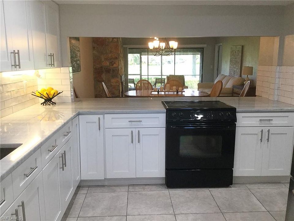 Spacious and Beautifully updated 2/2 condo in The Forest Country Club community. FIRST FLOOR END UNIT (more windows) Newly configured kitchen and master bathroom With high quality Forevermark white shaker cabinets with fully extending drawers and soft close, marble look granite and artisan backsplash. Custom skip trowel ceilings - NO popcorn ceilings in this condo!! 18" tile throughout. Impact resistant windows. Enjoy the amazing sunsets and gorgeous golf course views from the screened-in tiled lanai then sit by the fireplace on a cool winter evening. This condo is a short walk to the community pool. The Forest offers 2 championship golf courses, an active tennis club, pickle ball, bocce, fitness center, firepit and first class dining - many different membership levels available-not mandatory. Desirable west of 41 location and close to beaches, shopping, and the airport. Association has plans to replace all sliders with new hurricane glass sliders. CASH only
