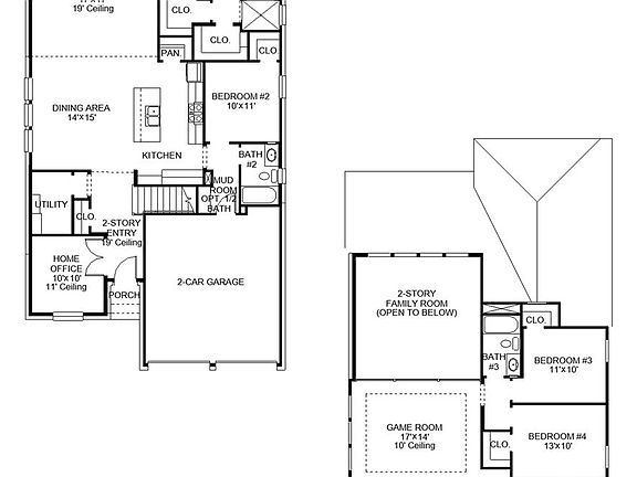 Private home office with French doors embraces the two-story entry. Past the stairwell you enter into the kitchen featuring an island with built-in seating, 5-burner gas cooktop and a walk-in pantry. The dining area boasts three large windows allowing ample natural light. The family room with extended ceilings and a wall of windows leads out to the covered backyard patio. The primary bedroom has three large windows. The primary bathroom features dual vanities, a garden tub, glass enclosed shower, and two walk-in closets. Upstairs you will find the large game room. Secondary bedrooms featuring ample storage and a shared bathroom complete the second level. A secluded guest suite with private bathroom is located off the kitchen. The utility room is centrally located off the living space. The mud room is off of the two-car garage.