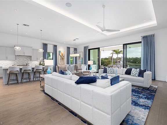 Welcome to a remarkable opportunity in the coveted Mediterra community—a 2020-built, custom-designed home that seamlessly blends elegance, modern convenience, and coastal serenity. As you enter, you’re greeted by stunning long views through the great room, leading your eye to the expansive pool area. An illuminated fountain accentuates the peaceful water views, providing a serene and captivating backdrop. The home's interior showcases exquisite wood floors and tray ceilings, enhanced by subtle indirect lighting that elevates the ambiance. The kitchen, a true culinary masterpiece, features a double-thick quartz countertop island, Sub-Zero refrigeration, an under-counter wine cooler, a full wine cooler, and a premium Wolf gas cooktop and oven, designed to impress and inspire any chef. For seamless entertaining, 10-foot impact sliders open up the indoor and outdoor spaces, allowing for effortless flow. The covered outdoor living area, complete with electronic screens and an outdoor kitchen, is perfect for hosting elegant gatherings or relaxing poolside on a sunlit afternoon. This home’s thoughtful design includes custom-built features like an oversized pantry, two built-in desks, and an inviting primary suite with a wall of glass doors leading to the outdoors. The primary bathroom is a luxurious retreat, boasting an oversized shower framed by elegant frameless glass. The secondary bedrooms each feature private en-suite bathrooms, and a versatile den can be designed to accommodate additional guests with ease. Additional conveniences include an oversized three-car garage, impact windows and doors, Hunter Douglas blinds, and a custom wood accent wall in the primary bedroom. Beyond the home, Mediterra offers an extraordinary lifestyle, featuring two Tom Fazio championship golf courses, pickleball courts, Har-Tru tennis courts, a state-of-the-art fitness center, and a fully renovated private beach club along the Gulf of Mexico. Enjoy convenience of your toes in the sand and golden sunsets at Mediterra's fully renovated private beach club. Imagine arriving having your car valet parked and lounge chairs and umbrellas waiting for your arrival or set up upon request. With 10,000 square feet of space, the upper level offers indoor and alfresco dining, a full bar, swimming pool along with lockers and dressing areas for changing. Spend the day and enjoy dinner while watching the sunset in the distance. Discover this unparalleled blend of tranquility and sophistication, and make this extraordinary home your own.