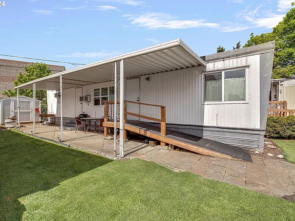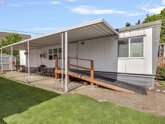 Adorable & affordable 1 bed 1 bath home in a 55+ community. Located at Mobile Estates, this home offers an open concept layout, full kitchen, dining area, gas stove, large living room, recently remodeled bathroom, spacious primary bedroom, all new updated windows, ramp for easy access, brand new storage shed, laundry area, AC units, and more. Space rent is $987/month. Includes: pool, sewer, water and trash. CASH ONLY.