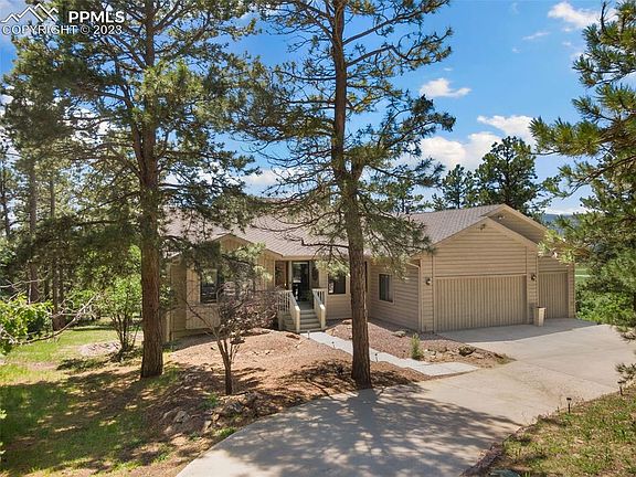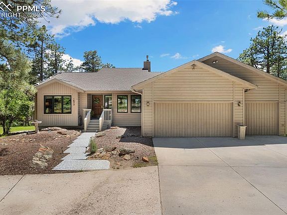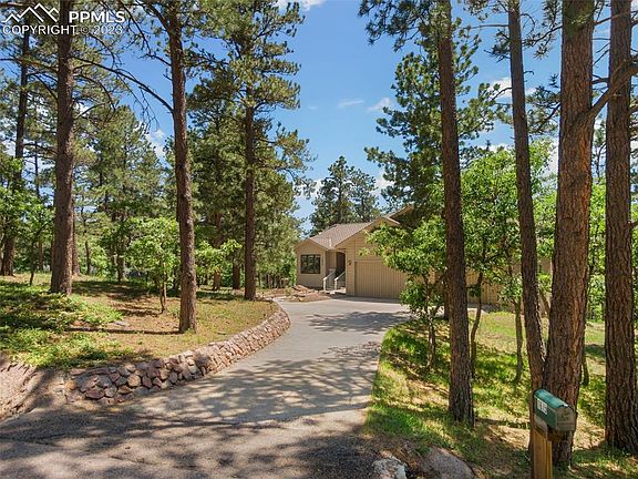 A rare opportunity to live in a beautiful home surrounded by whispering evergreen trees just minutes from Hwy 25 in Monument. You'll own nearly an acre of Ponderosa pines and scrub oak, nestled on a quiet cul-de-sac with your own hidden circular driveway and views of the mountains through the trees in luxurious Woodmoor. Lewis-Palmer school district is exceptional, and both middle and high schools are within walking distance! This unique custom home offers main level living with a spacious master suite, grand sunken living room, cozy brick fireplace, vaulted ceilings and a flood of natural light throughout! Ease out the living room on to a newer composite deck for amazing views of your nearly acre lot. The refurbished kitchen with newer stainless steel appliances will make entertaining a fun must! The front room can be used as an office, den, library or formal dining room. Follow the comfortable steps down to a fully furnished large walk-out basement featuring an amazing sunroom complete with a sunken hot tub! This amazing space will allow one and all to unwind from the day, relaxing and watching the wildlife go by. An amazing spot in the house to have coffee and enjoy a nice snowfall with the sounds and smell of your custom wood fireplace. Three comfortable bedrooms, laundry room, full bathroom and wet-bar area make this lower level walk-out a place of refuge! Only minutes from nearby amenities and I-25, easy for commuting to Denver or Colorado Springs.