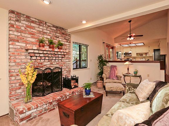 Beauty will surround you in the in the middle of this majestic property, with lots of sun. Relax & enjoy many areas of the 4 acre property. Reading, enjoying sounds and sights nature, hiking, seasonal spring runs through the property. Home is on a flat area 1/2 acre with a fenced yard, colorful gardens, fruit trees, mature trees throughout. As you enter the property through a private gate leading to circular driveway. Home interior, you will notice the tall ceilings, spacious open floor plan and large windows with breath taking views. Hardwood floors, spacious kitchen, sit up bar to enjoy your guests while cooking. Skylights, watch the stars and the moon smile at you through the skylight in the living room and the clouds float by in your bedroom. Fireplace, large guest bedroom downstairs with full bath, master suite with balcony and views of the yard & mountain, decks for entertaining, This home is a magical property.