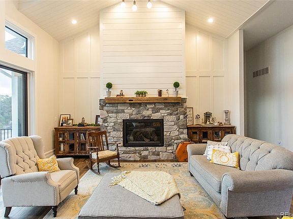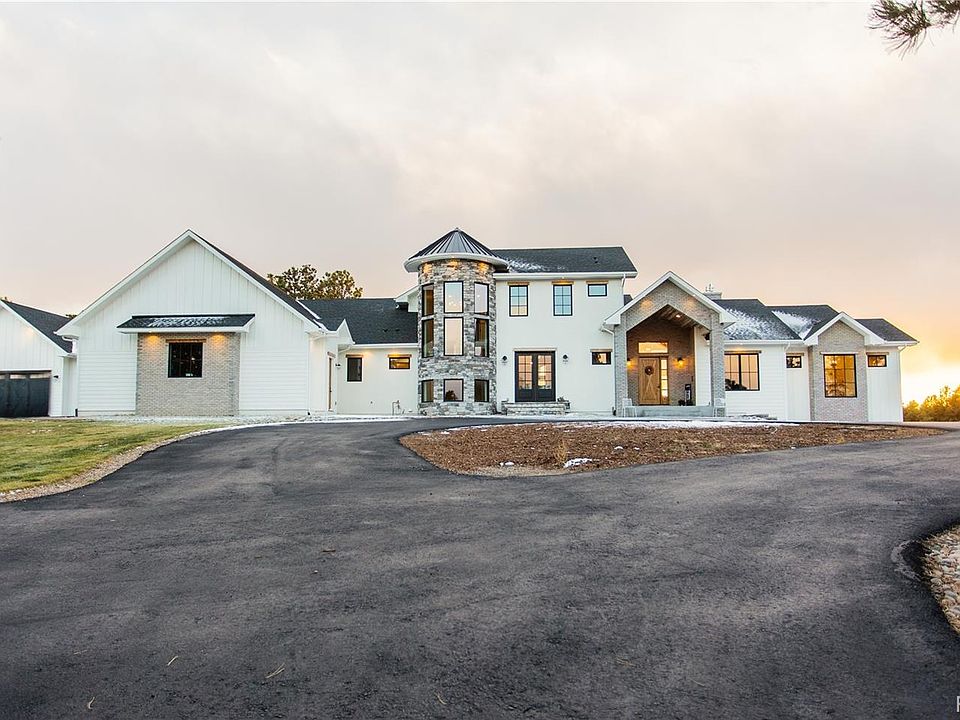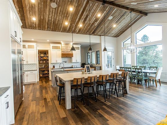 This luxurious, custom home sits on a beautiful and private 18 acre treed lot. Built with charm and character throughout, including solid wood beams, shiplap, barn wood ceilings, and the custom front door. The great room features a gorgeous fireplace, vaulted ceilings, and windows that frame the view of Pikes Peak. The great room opens up into the large kitchen and dining room. The kitchen boasts double islands with exotic granite and butcher block counters, a butlers pantry, and double ovens. The dining room walks out to the covered deck overlooking the lovely mountain views. Off of the main living area is an office and hearth room which walks out to the front yard. The main level master bedroom includes a fireplace, bay windows with great views, his and hers walk-in closets with an attached washer and dryer, and a 5-piece bath with double vanities and a jetted tub. Completing the main level is an huge laundry room with storage and desk space, a quaint mud room for lots of storage, and an oversized 5 car garage. Upstairs there are two ensuite bedrooms with private bathrooms and walk-in closets. The basement is very large and open with high ceilings - great for entertaining, especially with the wet bar and full refrigerator. There are two additional bedrooms with a jack and jill bath. One bedroom has a charming built-in bunkbed that can sleep up to four. The best part of the basement just might be the in-home gym featuring court lines for basketball, volleyball, and pickle ball. It also comes with 3 basketball hoops, storage, and a separate entrance for easy access. Right of the gym is a full bath and drinking fountain. Outside, the 18 acre lot offers lots of privacy and backs up to a walking/biking trail leading to Fox Run Park. Owners also put in a dirt bike trail on the back of the lot. Lot has permit for 2nd well that could be drilled. With all of the well-thought out details, this home offers privacy, comfort, and charm.