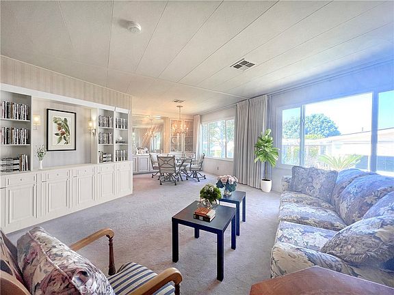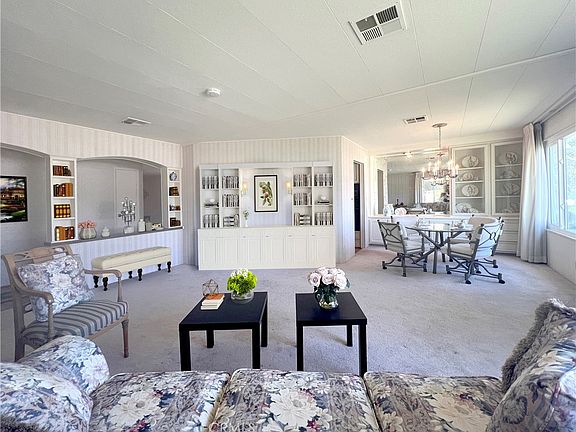 Beautiful park atmosphere in this Seniors 55 plus development ~ Tranquil walkways, lake and manicured landscape makes this a perfect place for senior living ~ Located in Yorba Linda, it was the first manufactured home community this city developed ~ Fabulous location! ~ Charming entry into a spacious covered patio that is large enough for a casual sitting area ~ Enter into a spacious living room that features an arched built-in display cabinet and lots of windows for natural lighting ~ Living room opens to formal dining room that has a beautiful built-in China cabinet ~ Kitchen features a 5 burner gas cooktop, window above the sink and white cabinetry ~ Kitchen opens to a spacious family room which is perfect space for casual entertaining ~ Primary bedroom has a mirrored wardrobe, walk in closet and a private bath with dual vanity ~ Additional bedroom is ample in size and has access to a full hall bathroom ~ 2 car tandem carport has convenient access to an inside laundry ~ Guest parking is available ~ Lake Park has a clubhouse, full kitchen, library, garden room that is great for card playing or enjoying time with your friends and neighbors ~ Lake Park also has a large meeting room, pool, and spa ~ A terrific place for seniors to enjoy an active lifestyle ~ RV parking subject to availability