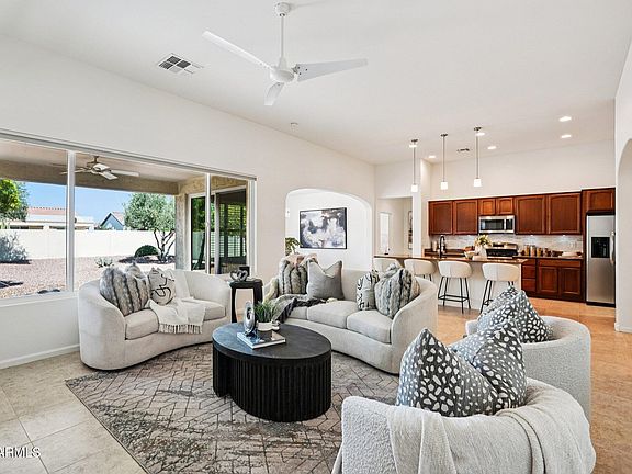 The gourmet kitchen boasts modern appliances, ample granite counter space, and a functional layout that flows effortlessly into the great room—ideal for hosting friends or relaxing with family. High ceilings and large windows create a light and welcoming ambiance throughout. Step outside through the sliding patio doors to enjoy an oversized backyard, perfect for outdoor dining, gardening, or simply enjoying the Arizona sunshine. Whether you're looking for a full-time residence or a seasonal retreat, this home offers a perfect blend of style and functionality at Goodyear's most sought-after active adult community that offers plenty of room for a future pool or your own backyard oasis. Convenience is key with this home located just 1 block from the community's oasis pool, and easy access to freeways and shopping. PebbleCreek enhances your lifestyle with 3 scenic 18-hole golf courses, 36 pickleball courts, tennis, bocce ball, 3 swimming pools and much more. With over 200 clubs and organizations, you'll have endless opportunities to stay active and engaged. Don't miss out on this gem in a vibrant community like no other.