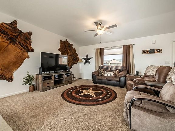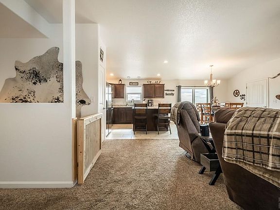 Beautiful home with an open floor plan that is perfect for gathering. Features 9' pan ceilings in the living room, dining room, and kitchen. Nice size primary bedroom with walk-in closet and 4 pc bath, 2 more bedrooms, and a full bath are on the main level. The lower level features a spacious family room with a pool table, a large 4th bedroom, and a full bathroom. There is plenty of storage space throughout the home. Quality built with R39 attic insulation, 6" exterior walls with R19 insulation, stubbed-in future sprinkler system line, and 95 % efficient Armstrong furnace. oversized garage with epoxy floors. Landscaping front and back. Fenced-in backyard with 3 different access gates plus a large shed for all your storage needs. A 10x12 floating deck is a perfect touch for enjoying the mountain views!