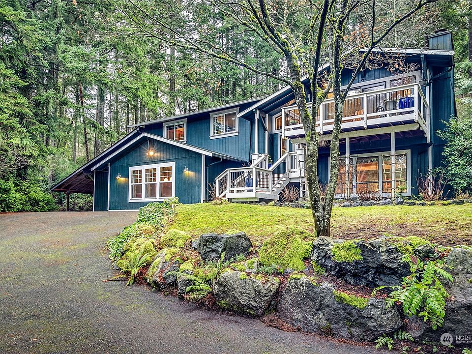 This wonderful spacious Poulsbo home sits on a large lot, just shy of an acre. There are 4 bedrooms, 2 of which are primary suites. In addition, there are 3 and 1/2 baths. The upstairs opens to a great room with a dining room, living room, and kitchen, overlooking both a front and back deck. The lower level has an enormous bonus room with built in cabinets, and a mud room. There is also a separate office along with the second primary bedroom. Bright skylights, large windows, and a high efficiency zoned heat pump. Wide open outdoors with fruit trees, fun hidden spots to captivate the imagination. RV/Boat parking.