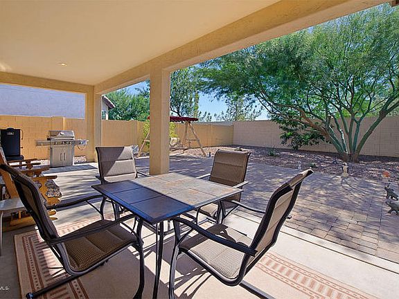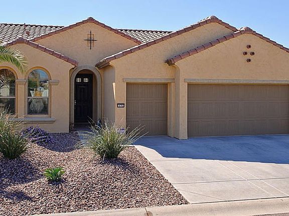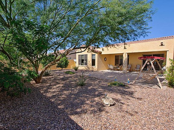 RIVA with Great Room, 2 bedrooms & den is move-in ready! Enjoy the mild Arizona winter from the large South facing back yard featuring an extra large patio with pavers, & low maintenance landscaping. This comfortable home has upgraded carpet and large tile in a neutral color palette. Spacious kitchen opens to the great room; large island for additional seating with pendant lights, easy care counters, stainless steel sink, & black GE appliances. Master bedroom with bay window. Additional upgrades include: surround sound, electrical outlet in great room floor, laundry room with utility sink & extra cabinetry, water softener, & ceiling fans. Extended 2 car & golf cart garage with abundant storage cabinets. Located in PebbleCreek; a resort community featuring world class amenities.