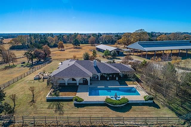 Incredible ranch near Tyler, TX. This 132 acre ranch features a beautiful 3600 SF Custom built Southwestern style home, ideal for entertaining, featuring arched doorways, custom wood ceilings, & ceramic tile flooring. There is a Gourmet kitchen with stainless appliances, granite, custom cabinets, opens to the formal dining and a magnificent living room with WBFP. There are four bedrooms, an office, large Utility room. The back yard has a beautiful pool overlooking lush Bermuda pastures w views that are magnificent. The 12 stall horse barn is complete w tack room, feed room, bathroom, wash rack and a custom built 90 X 175 indoor Arena. There are two manufactured homes on the property for staff or tenants.
