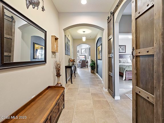 Welcome to your dream home!! This gem is in the highly sought after Manchester Lakes Community. This 3 bedroom 2 bathroom home exudes sophistication with it's 42'' espresso wood cabinets, and it's beautiful lighting fixtures, and 10' ceilings throughout the home. The open floor plan with 12' ceilings in the great room, and is accented by 8' handcrafted barn door leading to your extra bedrooms with gorgeous plank flooring, adding a bespoke charm. Retreat to your master ensuite with a fully tiled shower, and upgraded Moen plumbing fixtures. Double pane windows, and hurricane shutters, and a brand new roof to keep you secure during our stormy Florida weather. Step outside on your patio oasis to relax, and enjoy the views of the pond, and all the wildlife! This is the perfect home to entertain in! Located near fantastic shopping, the picturesque Indian River Lagoon, and great schools, this home offers both comfort, and convenience to the discerning buyer! Don't miss this opportunity