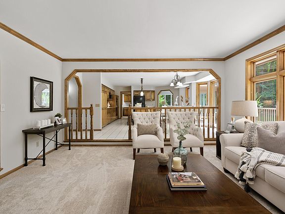 Meticulously maintained 2-story on a beautiful .35-acre cul-de-sac lot! Extremely spacious with all the room for your living & entertaining needs! Fantastic location close to parks, Crystal Lake & Golf Course, shopping, dining, access to I-35 & more. Fresh interior paint, new carpet & stylish new lighting. Foyer features 17-ft ceiling, formal dining to 1 side & a great office or main level bedroom to the other side. Spacious kitchen with tons of storage, center island with seating & adjoining informal dining with access to the deck & backyard. Charming sunken living room with cozy wood-burning fireplace & custom built-ins. Main level primary suite with walk-in closet & private bath. Convenient main level laundry & access to the attached 3-car garage. Upper level has 2 bedrooms, full bath & bonus office & storage. LL has a great bonus room with access to the garage, great family room, recreation space & more! Wooded backyard with privacy, lush landscaping & an expansive deck!