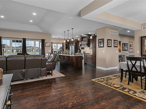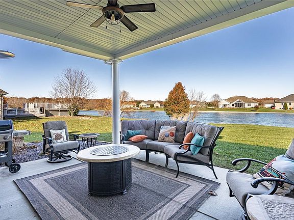 Experience living in Stoneridge Subd with its own neighborhood Park. This newer Ranch home is located on a large pond with beautiful views from the covered back Patio featuring an outdoor TV, speakers, and LP gas Grill! The open concept floor plan features the LR with tray ceiling and a gas Fireplace w/Stone wall and a surround sound system! The large custom Kitchen features a Gas range, W/I Pantry, SS appliances, a separate beverage cooler, Granite counters, and a huge eat-on center Island! The Master features crown molding, mood lighting, and tray ceiling. The Master Bath features custom tiled Shower, dual bowl Vanity, marble counters, make-up counter, and His and Hers W/I Closets! The other two BR are on the opposite side of the home. The oversized Garage (43.4' x 31.8') features a utility Sink, custom Workbench, gas Heat, and floor Drains! The Basement features 9' walls, and is all ready to add a 4th BR, 4th BA, and a Wet Bar. There is also a SAFE room with steel door!