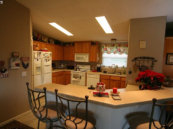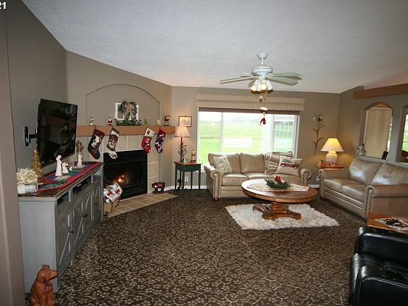 wide open spaces inside and out. This is a very comfortable plan with views to the north out the Living room while sitting by the fire. Primary bedroom is large with attached ensuite with walkin closet. Guest bedrooms are on the other side of the house with living,penensula kitchen and formal dining room in the middle.Vaults ad to the open feeling.Slider off dining to the covered patio. Nicely landcaped and treed lot with a shop big enough to store the RV or toys or just have workspace.