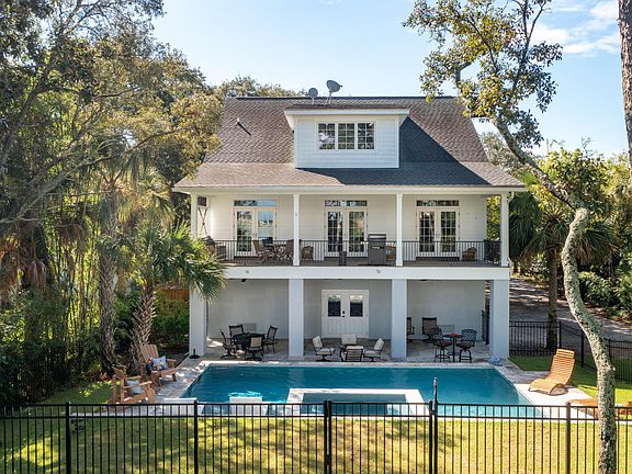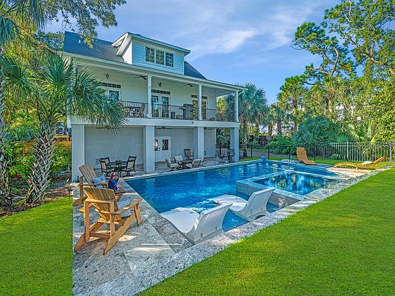 Breathtaking Custom WaterFront Home on a half acre lot - one mile from Folly Beach! Attention to detail inside and out! Before entering this meticulous home, stroll to the back yard and be impressed. The spectacular Heated Heritage Pool! Endless pool swim lane, 8 x 10 Raised Hot Tub, Internal Cleaning System, UltraViolet Light Water Treatment, Ozone Treatment System, Floating Chairs! Then let your eyes continue to the Water! Ahhh. . . the Water! The covered pier head dock has a new roof, walkway, extended rails and LED lighting! Lower your boat from the 9,000 pound electric lift to the alluring creek to Long Island River! Lush landscaping and nature abounds! Now the home! This 2379 square foot home is located on beautiful Oak Island, nestled among majestic oaks and swaying palms. Mint Condition! Upon entering, you'll find two large guest rooms, one on each side of the home, and a bath on the left. Elegant oak floors continue as you enter the open concept kitchen, white cabinets, frosted glass doors, high end appliances and granite countertops. The free standing natural gas fireplace is perfect for chilly evenings. The master suite has a walk-in closet, huge travertine bathroom, complete with dual sinks and claw foot tub.The enormous porch is great for entertaining and awesome views. An almost 700 square foot bonus room, bathroom, laundry and another walk-in closet are upstairs. Not included in the square footage is a 500 square foot downstairs area which could easily be considered an apt. or guest suite, with kitchenette, bathroom, living area and several charming barn doors. The double car garage has plenty of storage. Don't forget the new high efficiency HVAC, Leaf Fitter Gutter on rear roof and LED low voltage front and back yard lights. Why Wait for new construction? This magnificent home has it all Now! Ten minutes from Historic Downtown Charleston!