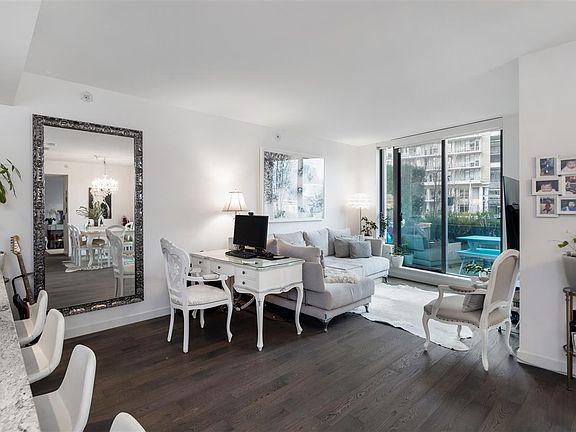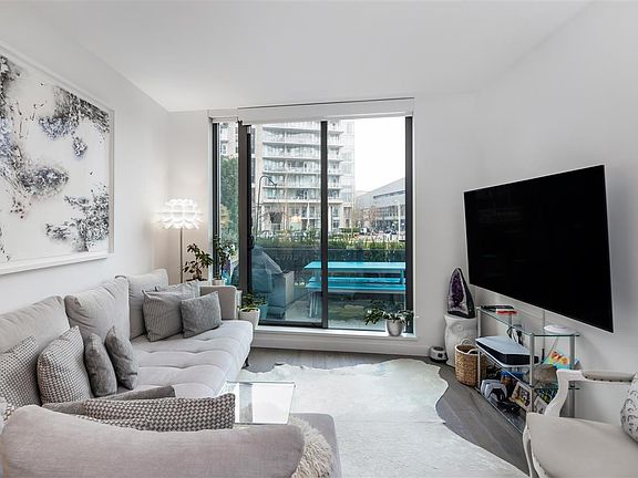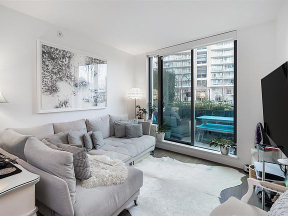 WOW! Rarely available spacious townhouse 2 BED + Den + 3 Full Baths. This full concrete townhouse has a massive 295sf private patio that faces City Park, False Creek/Science World and mountains. 1 large EV parking + 1 large regular parking + 1 large storage locker. Welcome to one of the most sought after townhouses in all of Olympic Village. Walk into your front door from the lobby or even better, when your front yard is the city park with meadow flowers, that may be a better option. Great for dog owners, easy in and out. As you enter, ask Google or Alexa to close or open your blinds. The main floor storage room has plenty of space for your wine collection. And yes, this is parcel zero so no roads to cross to the Seawall. Welcome to the good life, welcome to your future home.