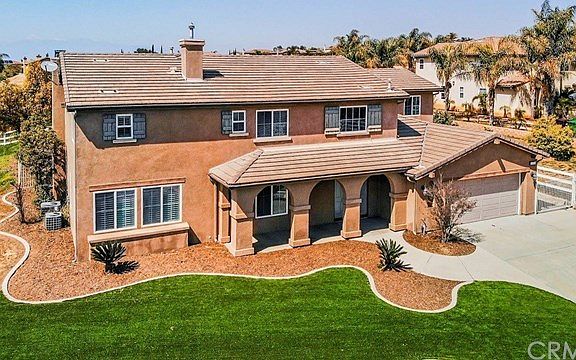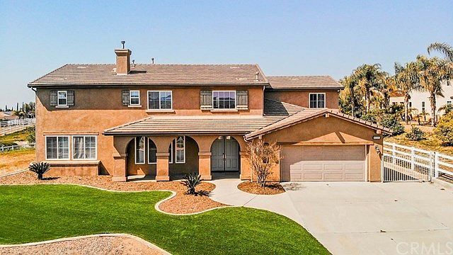 Welcome to a gorgeous two story home with beautiful views of rolling hills laced with equestrian fencing. Enter with view of high entry foyer and chandelier. To the left is a spacious living room and lovely fireplace that is two sided into the study/den on the other side. Huge kitchen with long breakfast/bar island that is open to a family room that has an additional decorative fireplace and tiled dining area to the front of island. Kitchen comes with stainless steel appliances, two built in stoves to accommodate entertainment for a crowd. Formal dining room big enough for large table and china hutch. Plantation shutters and recessed lighting throughout. Huge upstairs master suite with large walk-in closet, separate shower, stool room and deep bathtub to relax in at the end of the day. Breathtaking views from all of the upstairs bedrooms. One bedroom with it's own 3/4 bath. 2 more Bedrooms with tandem full bath that has separate sink area and full tub/shower. Included upstairs is a very large entertainment room big enough for a pool table and much more - could be used as a large 5th bedroom if desired. Front and back yard nicely landscaped with artificial grass in front and rounded cement area for gazebo and BBQ in back. Tasteful fencing surrounds immediate back yard with access to balance of 1.27 acres that could be used for equestrian stables and/or corral. 4 Car Tandem attached garage with epoxy flooring.