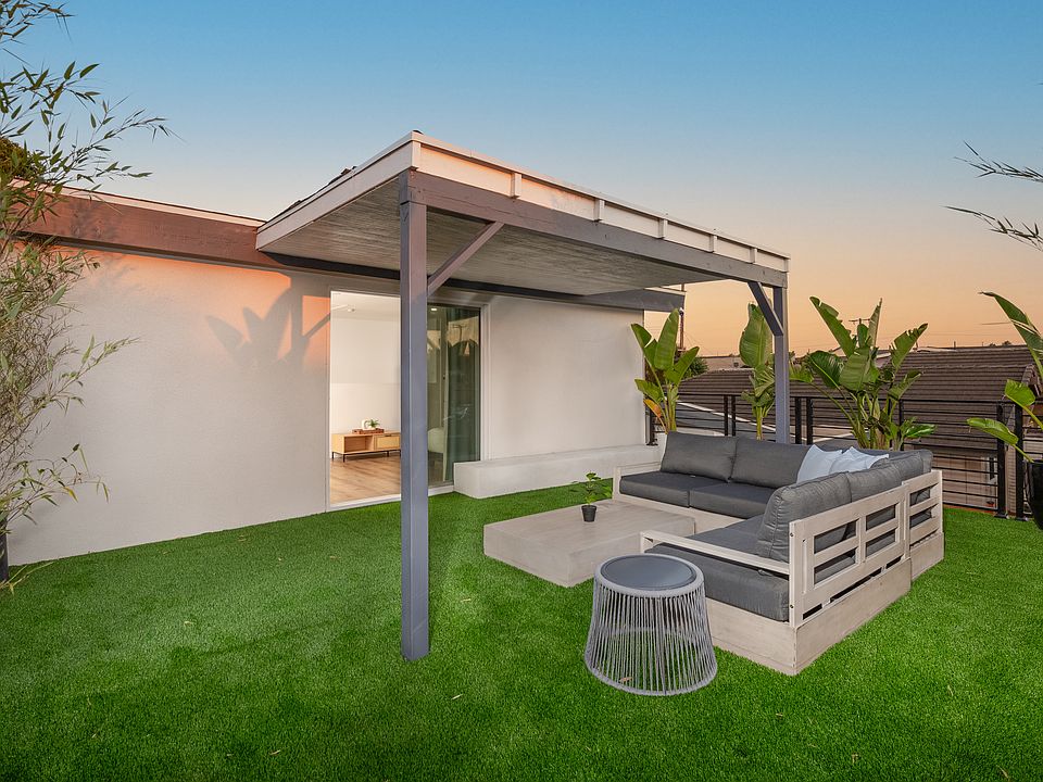 Backyard has full amenities like patio, sofa chair, table ansd out door bbq with lights, fireplace and more
