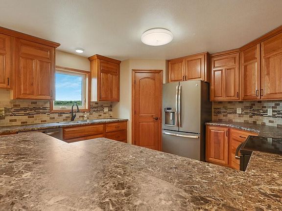 Beautiful zero entry ranch home sitting on 1.5 beautifully landscaped acres just minutes from town. Wonderful layout with master bedroom with on-suite bath and walk-in closet on one end and 2 additional bedrooms and full bath on opposite. Lots of natural light in large living room and dining area with sliding glass doors leading to private backyard. Many updates including totally remodeled kitchen with large pantry, custom cherry cabinets in kitchen and laundry room, and refinished original wood floors. 330 sq. feet of finished storage space with additional 10 X 12 bonus room/office above 2 car attached garage. Additional 26 X 28 2 car finished, heated detached garage. Covered front porch/patio to enjoy the wildlife and breathtaking sunsets. Apple tree, lilac bushes, and plenty of yard to play makes this the perfect country paradise to call home!