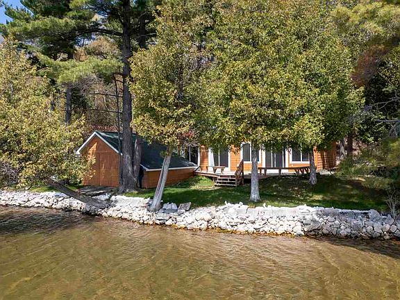 Lake Charlevoix updated cottage sitting on 5.8 acres with 116 ft of sandy frontage. The home is facing west for incredible sunsets. 2 bedrooms 2 baths plus a sleeping loft. The large porch is steps from the water's edge for a breathtaking lakefront experience. Attached boathouse could be converted into additional living space. There is a large pole barn for toy storage. Owners just received transferable variance approval from the township to more than double the square footage with a remodel. Such a wonderful place to build family memories or a quiet retreat to work remotely. FLOOR PLANS ATTACHED ARE OF A POSSIBLE REMODEL NOT CURRENT LAYOUT.