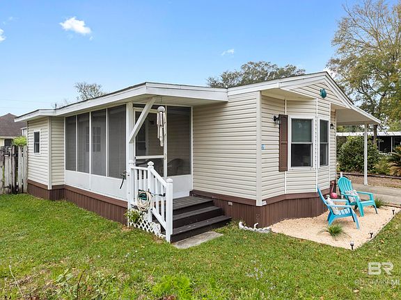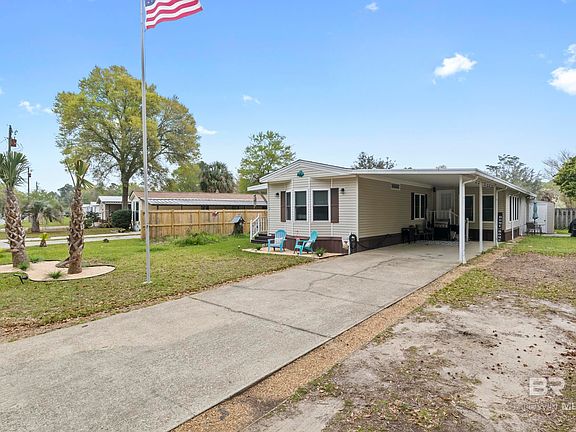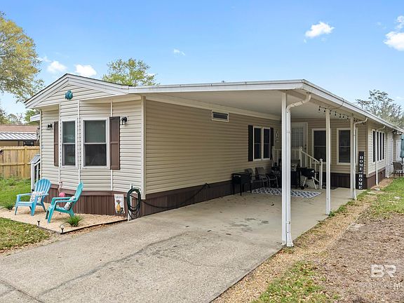 Located in the desirable Spanish Cove community —just minutes from Perdido Bay, the public boat ramp, the FL state line and 20 minutes from the white sandy beaches! This well-maintained 2-bedroom, 2-bathroom mobile home boasts ample storage with two storage rooms, a workshop, and generous closet space in both bedrooms. Recent upgrades include a new roof in 2024, high-energy-efficient windows installed in 2021, updated plumbing in 2020, and durable LVP flooring throughout. The washer, dryer, and refrigerator are included with the sale. Outdoor features enhance the home's appeal, including a screened-in porch in the front and a large carport at the side entryway. A heated and cooled sunroom provides additional living space and a bright, inviting atmosphere. The current owner has introduced modern updates such as new kitchen hardware, fresh interior paint, new fencing between neighbors, and the addition of two Sabal Palms in the front yard—ideal for hanging a hammock swing to enjoy the warm days near the bay. The landscaped yard also features Sago palms, azalea bushes, other seasonal plants and a blueberry bush, offering the delight of fresh berries from your own backyard. Spanish Cove is a vibrant golf cart community that caters to those seeking an active outdoor lifestyle. Residents enjoy a wealth of amenities, including 24-hour security, a year-round junior Olympic-size pool overlooking Perdido Bay, a fitness center equipped with modern exercise equipment, and the Cove Clubhouse, which features a stone fireplace, full kitchen, dance floor, free Wi-Fi, and a spacious outdoor deck with a grill. The community also offers a beach area, nature trails, picnic spots, playgrounds, tennis and pickleball courts, shuffleboard, and a pier for fishing and boating activities. An array of organized activities such as exercise classes, line dancing, bingo, book clubs, and potlucks foster a strong sense of community and engagement among residents. Buy Buyer to verify all informatio