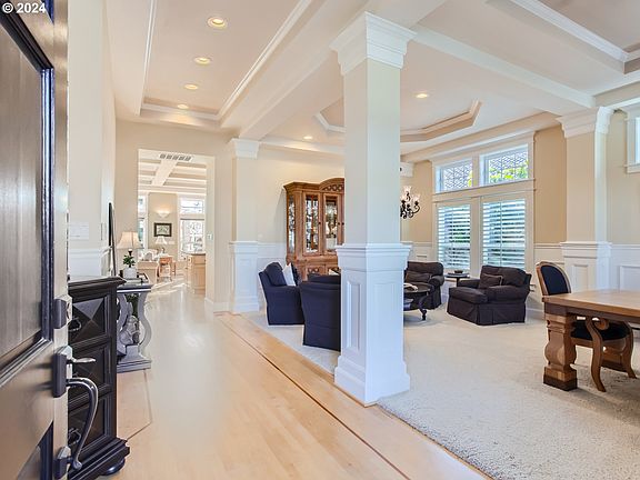 One level custom designed home on a quiet cul-de-sac in the coveted Stonegate Waterhouse neighborhood. Minutes to Nike Headquarters & abundance of shopping centers. This stunning home has elegant craftsmanship & unique amenities throughout. Upon entering each room, you will be greeted with beautiful high box beamed ceilings with custom trim, creating a spacious & elegant feeling throughout the home. Transom windows with wood wrapped trim creates natural light in every room. Hardwood floors with inlay flow throughout the home. There is a formal living and dining room. The heart of the home features a spacious great room layout with an expansive kitchen, casual dining area and inviting living room with custom gas fireplace & beautiful built-ins. Culinary enthusiasts will delight in the gourmet kitchen, equipped with a gas Wolf range, granite countertops, wine refrigerators, and built-in cabinets for ample storage. Sound system throughout the home, which flows to the expansive & inviting outside patio, perfect for entertaining. There is also a covered area for your BBQ, great for gatherings. This home has 2 newer water heaters (installed 2023) and a recirculating hot water system for instant warmth. Stay comfortable year-round with the newer HVAC system (installed 2022). There is a newer 50-year presidential roof and gutters (installed 2018), expansive 3 car garage with a 200 Amp Manual Transfer Switch ready to power essential appliances during unforeseen outages with your generator. Neighborhood has beautiful walking trails and a small park with a lake and gazebo. A truly one of a kind home with unique custom features for comfort and convenience. Seller is Listing Agent.