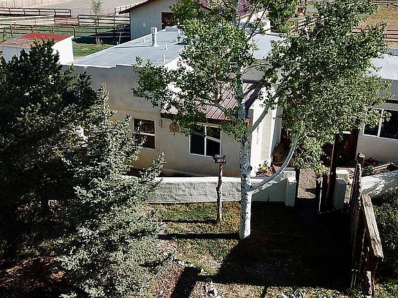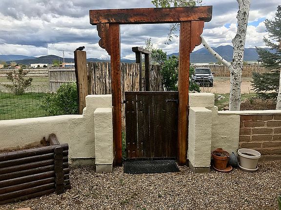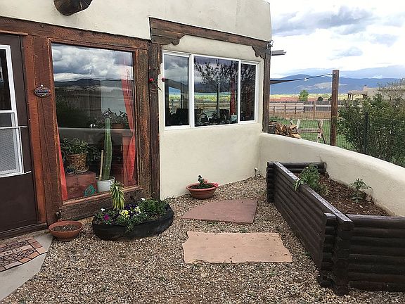 Viga ceilings, hardwood floors, large widows with Mountain Views. Two living areas. Adobe. Horse property. 1.59 acres fenced and cross fenced. Three storage sheds. Access to rent barn stalls. High efficiency Heathstone soapstone fireplace.