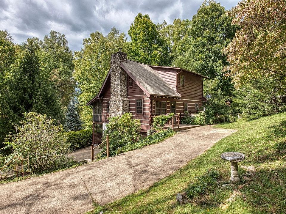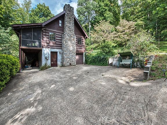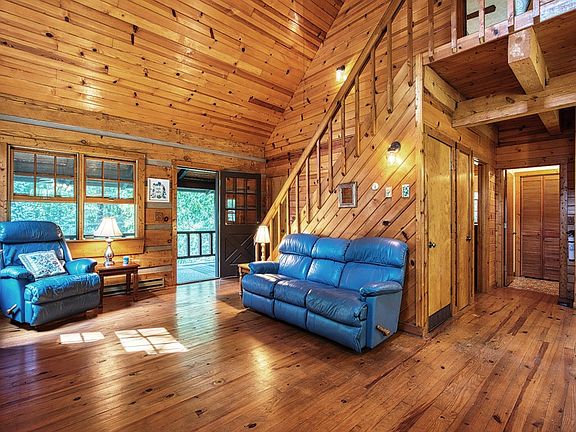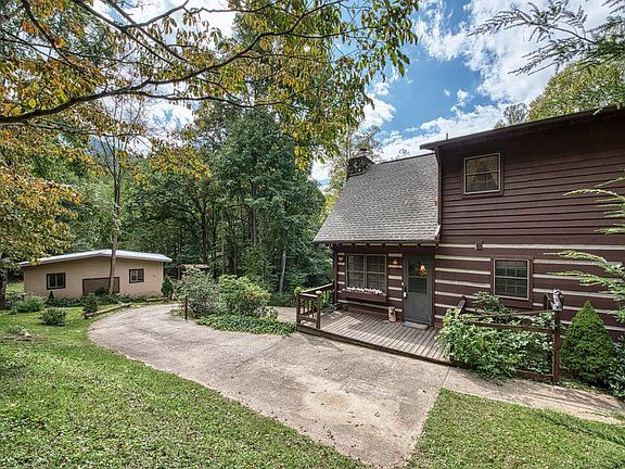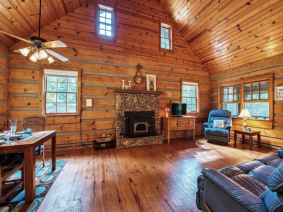 Log 'Chink' Cabin on the Creek with 900SF studio/workshop! Rustic, log, T&G wood, 2-story great room and stone fireplace, OPEN floor plan. Cozy kitchen, Laundry and Master on Main. Bring your RV! Additional Bed and Bath on the upper level. In the basement you'll find a spare room/office with bath along with the garage and large workshop area. Three(3) parcels totaling 1.39+/- acres. 1200+ Sq ft of Lovely Log Cabin with additional 198 Sq Ft of heated area in the basement. No City Taxes, Light/Limited HOA (house only). The 2 additional parcels are NOT in HOA - Park your Camper on the extra lot next to the 30ftx30ft workshop on slab, with large level yard, creek, wooded paths, firepit, and rustic gazebo! Convenient Driveways to Main and Basement/Garage levels. Freshly stained and chimney rebuilt/lined! FURNITURE Included! 34x8ft Screened Porch.