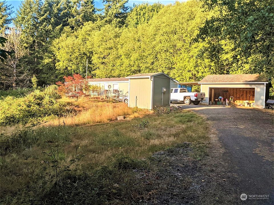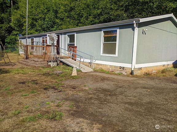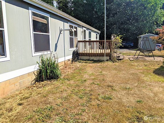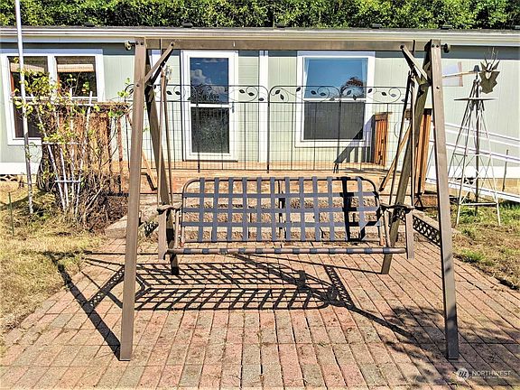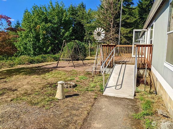 Beautiful wood interior in this 2001 hilltop mf home overlooking the valley. In almost 1,800 square feet, all of the living spaces are easy flow and spacious with laminate & vinyl flooring. Primary bedroom has flex-room space so is double size normal. Both bathrooms have step in showers. Double car garage has a carport on the side and a lean-to off the back. Heatpump for heat and AC. Partial fencing is up for pet containment. Pump house serves two properties. Covered back deck has a hottub that sellers have never used & don't represent to work. Woods back up to this sweet property affording privacy.